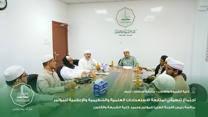 عقدت اللجنة التحضيرية للمؤتمر العلمي الدولي "قضايا مستجدة في بيوع الآجال" اجتماعًا تنسيقيًا يوم الاثنين 11 شوال 1447هـ الموافق 30 مارس 2026م، برئاسة رئيس اللجنة العليا للمؤتمر وعميد كلية الشريعة والقانون الدكتور عبد الله عوض بن سميط، لمتابعة الاستعدادات العلمية والتنظيمية والإعلامية للمؤتمر.
