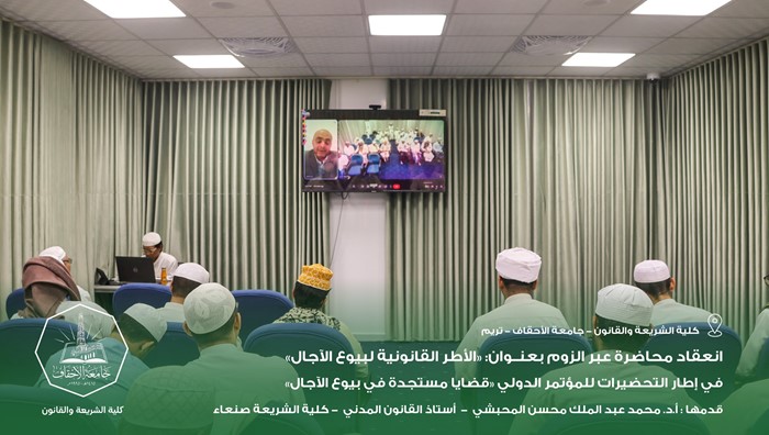 ضمن الإعدادات العلمية للمؤتمر الدولي «قضايا مستجدة في بيوع الآجال» الذي تنظمه كلية الشريعة والقانون، عُقدت صباح يوم الاثنين 21 شعبان 1447هـ، الموافق 9 فبراير 2026م، محاضرة علمية بعنوان «الأطر القانونية لبيوع الآجال»، قدّمها الأستاذ الدكتور محمد عبد الملك محسن المحبشي – أستاذ القانون المدني بكلية الشريعة والقانون، جامعة صنعاء – عبر قاعة الزوم.