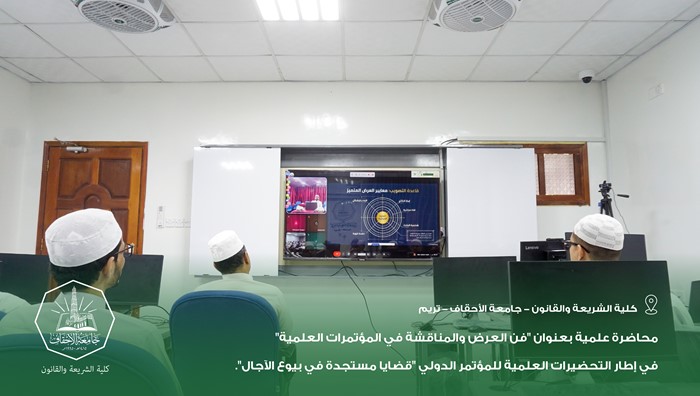 عقدت كلية الشريعة والقانون بجامعة الأحقاف، صباح يوم الاثنين 25 شوال 1447هـ الموافق 13 أبريل 2026م، محاضرة علمية بعنوان "فن العرض والمناقشة في المؤتمرات العلمية"، قدّمها المستشار القانوني الدكتور هاشم بن علوي مقيبل، رئيس وحدة الخريجين بجامعة الأحقاف، عبر منصة زوم.